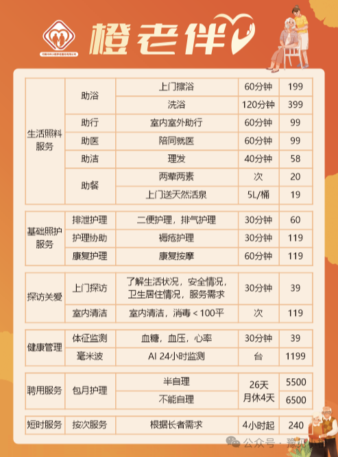针对能够自理或半自理的老年群体,“橙老伴”也开设了六大类单项服务模式。包含生活照料服务、基础照护服务、探访关爱服务、健康管理服务、聘用护理服务、短时小时工服务,覆盖老年群体的日常生活各方面,致力于让老年生活更加便利、健康和舒适。