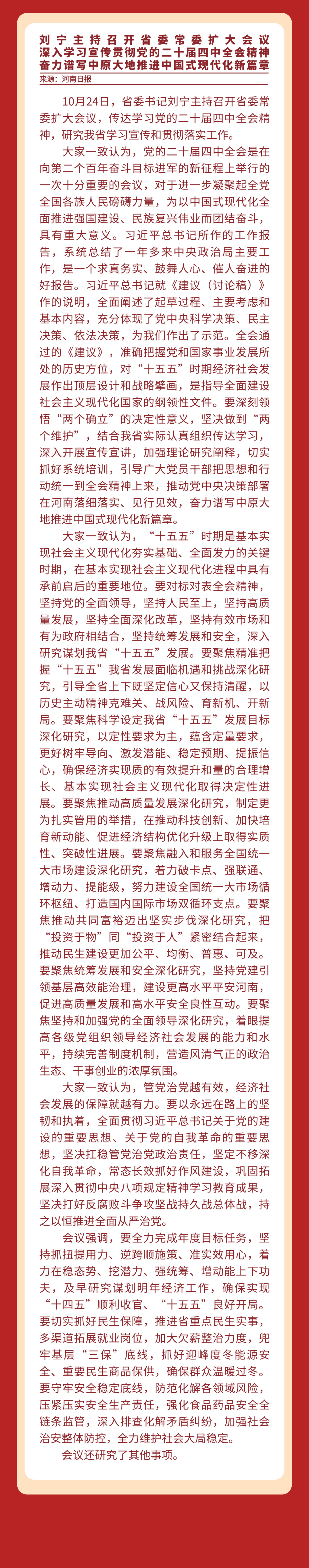 刘宁主持召开省委常委扩大会议深入学习宣传贯彻党的二十届四中全会精神奋力谱写中原大地推进中国式现代化新篇章